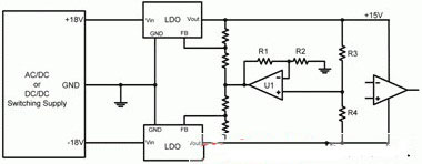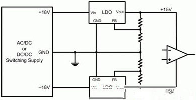 圖2顯示了一個典型運算放大器電源電路的示意圖。此處,一個開關(guān)電源提供一個正18V和一個負18V。兩低壓降(LDO)線性穩(wěn)壓器進一步將±18V調(diào)節(jié)至±15V。該LDO一般安裝在電源和運算放大器之間,旨在降低開關(guān)電源產(chǎn)生的高頻開關(guān)噪聲。LDO具有較高的電源抑制(以比率表示,PSRR),其減弱了寬帶頻率下LDO輸入的噪聲。