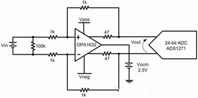 由于運算放大器的PSRR進一步降低了電源的微小變化,因此您可能會錯誤地得出如下結(jié)論:電源電壓的微小變化在系統(tǒng)中影響極小或者沒有影響。作為一個定量舉例,我們可對一個全差動運算放大器進行分析,其將信號緩沖至一個24位ADC。