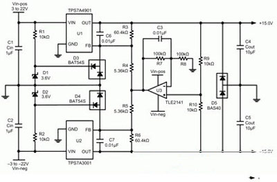 圖5所示電路使用一個如TPS7A3001等可調(diào)節(jié)、負輸出電壓LDO線性穩(wěn)壓器,以及如TPS7A4901等可調(diào)節(jié)、正輸出電壓LDO。U3、R7-R10和C3均為增加的組件,用于追蹤。R1、R2、D1-D5均為增加組件,用于將反饋引腳的電壓控制在其各自產(chǎn)品說明書額定的絕對最大電壓范圍內(nèi)。