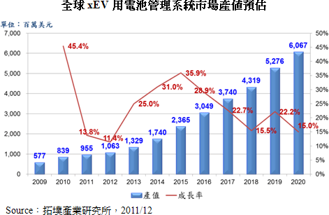 因此,透過BMS能準確量測電池組使用狀況,保護電池不至于過度充放電,平衡電池組中每一顆電池的電量,以及分析計算電池組的電量并轉換為駕駛可理解的續航力信息,確保動力電池可安全運作。拓墣預測2012年全球BMS市場產值成長逾10%,2013年至2015年成長幅度將大幅躍升至25%~35%。