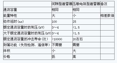 表1是不同類(lèi)型的避雷器在同等測(cè)試波形(10/350μs)條件和相同的通流容量下的性能比較: