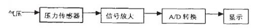 下面以測(cè)量輪胎氣壓為例詳細(xì)闡述氣壓傳感器在汽車輪胎方面的應(yīng)用。此種設(shè)計(jì)可做成一種便攜式的裝置,測(cè)量時(shí)將氣壓傳感器的表置于輪胎氣門嘴上,這時(shí)胎壓作用于傳感器的膜片上,通過壓阻效應(yīng)和系列變換輸出微弱的電壓信號(hào),將電壓信號(hào)進(jìn)行相應(yīng)處理顯示電壓值。由此可知不同的氣壓對(duì)應(yīng)著不同的電壓值,即氣壓值和電壓值是一一對(duì)應(yīng)的,從而間接測(cè)量了氣壓值。胎壓測(cè)量電路方框圖如圖4所示。