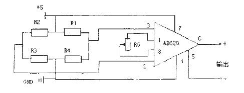 我們選用的高精度低噪聲儀用放大器AD620,可以用在傳感器輸出信號(hào)小的放大器中,如光電池傳感器、應(yīng)變片傳感器以及壓力傳感器等。由于它具有低噪聲、增益精度高、增益溫度系數(shù)小和高線性度等優(yōu)良性能。用于此系統(tǒng)中是非常理想的。AD620是一種只用一個(gè)外部電阻就能設(shè)置放大倍數(shù)為1-1000的儀表放大器,具有良好的直流性能和交流性能,AD620的體積小、功耗低成為應(yīng)用在壓力傳感器中的重要因素,傳感器信號(hào)放大電路如圖5所示。