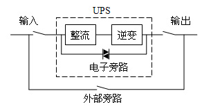本系統設計利用美國山特公司3C3 UPS的特性,該UPS有一個內部電子旁路檢修開關,UPS在關機狀態下,電源是通過UPS內部電子旁路直接輸出供電。外部再加一個旁路開關(圖1),外部旁路開關與內部電子旁路開關形成并聯。UPS加入供電系統時, UPS必須在關機狀態下,接通UPS輸入輸出端開關,UPS與外部旁路開關形成并聯接通,然后斷開外部旁路開關,再將UPS開機。UPS退出供電系統時,必須先將UPS關機,接通外部旁路開關(若UPS未在關機狀態下,相當于UPS在開機時輸出端加入反向電壓,UPS可能燒毀),斷開UPS輸入輸出端開關, UPS退出供電系統。這樣就很容易做到將UPS加入和退出供電系統中。