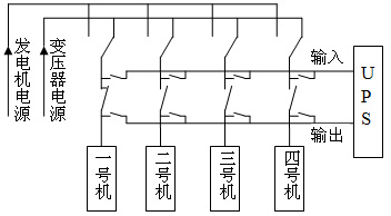 廠區供電系統是由一臺630kw變壓器和一臺800kw備用發電機組組成,變壓器和發電機的切換方式是通過一個雙頭刀閘進行切換的,要在正常生產情況下對四臺假捻機同時進行電源切換,需要一臺480kw 或四臺120kw 的UPS不間斷電源;發電機在空載時,最大能同時加載負載是發電機功率的50%,需要配備發電機的功率為1200kw,現有發電機滿足不了要求,只能采取逐臺切換方法。