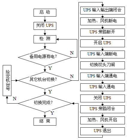 本系統主要是利用現有發電機組在不停機的情況下進行雙電源切換。原來電源切換是在主供電回路上通過一個雙頭刀閘切換,現在將用電系統分割成四個單元,在每個分路上各安裝一個雙頭刀閘,分別對假捻機進行逐臺切換。雙頭刀閘切換是人工操作,刀閘在轉換過程中會出現瞬間斷電現象,這樣就會造成假捻機停機,這是電源切換不能連續生產的原因,解決這個問題是本方案設計關鍵。所以,在電源切換前先將要切換電源假捻機的電加熱和風機停下來降低負荷,然后將不間斷電源UPS串聯在要切換的電路中,雙頭刀閘轉換時用UPS的電池組為假捻機提供傳動系統的電源,就不會出現斷電現象,可以對該假捻機進行電源切換。切換完成后將UPS退出供電系統,再將電加熱和風機開啟,這樣就完成了一臺假捻機的切換。再進行下一臺的切換,以此循環便可完成全部假捻機的切換(圖2)。