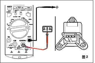 2.關閉點火開關,斷開傳感器的電子連接接頭。黑色表筆插到儀器的“OUTPUT—”的插孔,另一端搭鐵(使用鱷魚夾),紅色表筆插到“+OUTPUT”插孔,另一端與傳感器的輸入信號線連接(可以使用萬用測試線),如圖2所示。
