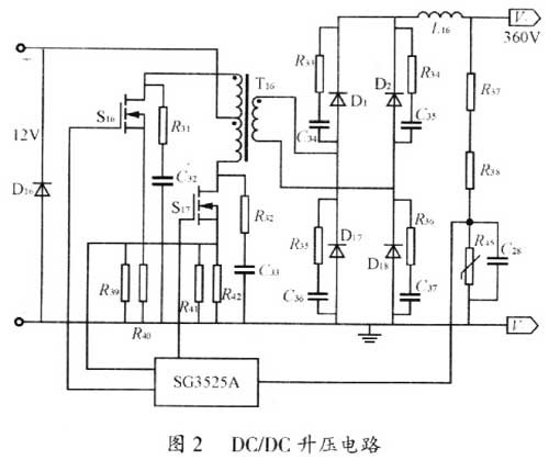 其工作原理為將升壓變壓器的中心抽頭接于正電源,兩路相反的PWM驅動脈沖送至開關管S16、S17的基極,從而控制兩只功率管交替工作,得到的方波交流電壓經變壓器輸出,經電感L16和電容濾波得到360V直流。電流檢測電阻(R41//R42)得到的電壓接到SG3525A的腳10來實現過流保護。R37、R38和R45為電壓采樣,構成電壓負反饋,因而提高了電路的可靠性。SG3525A及控制電路的電源都來自蓄電池,D16為防反接二極管。DC/DC從12V蓄電池電壓升到360V直流電,供后級鎮流電路點燈。