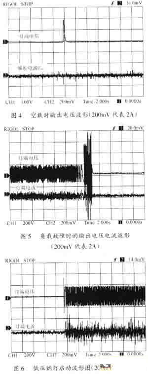在低壓鈉燈電子鎮流器中采用了新型的異常保護電路和短路保護電路。如圖4所示,在不接低壓鈉燈的情況下,在100ms的時間內電源先啟動后關斷,其中通道1為低壓鈉燈電壓波形,通道2為半橋式逆變器芯片供電電源。在低壓鈉燈正常工作時,如燈突然斷開或接觸不良,即燈開路的情況下的波形圖,如圖5所示。同樣半橋式逆變器芯片IR2153供電電源斷開,半橋逆變器停止工作。圖5中通道l為低壓鈉燈正常工作電壓波形,通道2也為半橋式逆變器芯片供電電源。這樣不僅保護了MOSFET功率管不因嚴重發熱而損壞,而且還能在燈開路的情況下使半橋逆變器停止工作,節約電能。