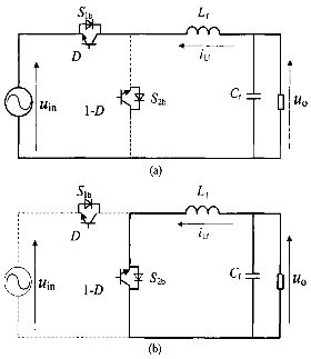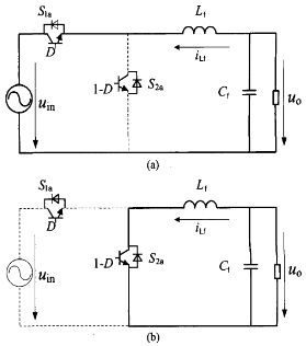 當開關管S1b開通、S2b關斷時,輸入電壓通過開關管S1b、電感Lf給電容Cf和負載供電,如圖4(a)所示;當開關管S1b斷開,S2b開通時,電感電流iLf經Lf、開關管S2b的反向二極管、Cf和負載續流,Lf和Cf共同向負載供電,如圖4(b)所示。