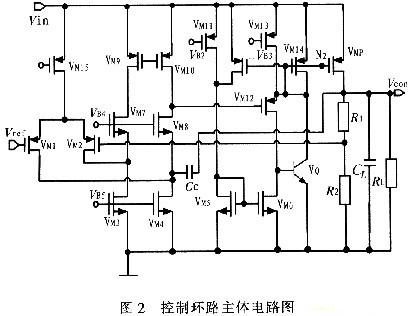閉環(huán)控制系統(tǒng)的主體電路如圖2所示,VM1~VM8組成折疊式的誤差放大器,VM9~VM10組成單級的電流鏡作為負(fù)載,這樣做的好處就是采用10 pF左右的補償電容就可以使系統(tǒng)達到穩(wěn)定。VM5~VM14和VQ組成級間緩沖級。R1和R2組成反饋網(wǎng)絡(luò),其中