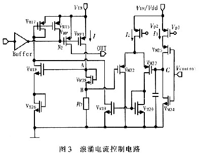 由上面分析可知,由于N2節(jié)點電壓迅速變化,導(dǎo)致大的浪涌電流流過P功率管(VMP管)。因此只需要控制N2節(jié)點電壓的變化就可以實現(xiàn)電流的控制,控制該浪涌電流變化無非就是控制其變化的斜率和峰值。其具體的電路原理圖包括兩個部分,即浪涌電流的斜率控制部分和峰值控制部分。具體的實現(xiàn)電路如圖3所示。