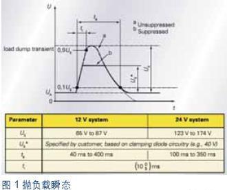 幾乎所有直接連接至汽車電池的電子組件和電路都要求保護,以免于受到抑制、瞬態電壓(高達60V)和反向電壓狀態的損害。對于這些電子電路而言,必須能夠經受住電源線路上一定程度的過電壓,這也是種常見的要求。對于那些要求任何特殊車載電子系統的主電源輸入均能夠在各種不同瞬態電壓狀態(包括交流發電機拋負載)下工作的車載系統來說尤為如此。