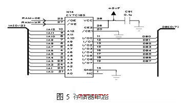 通過軟件參與設(shè)置,很容易得到全頻段內(nèi)的預(yù)置誤差數(shù)據(jù)。對于2-20GHz的微波振蕩器,如果每隔5MHz設(shè)置補(bǔ)償一個點,那么存儲器至少需要3600個地址空間,在此選擇8k×8靜態(tài)存儲器芯片,存儲空間滿足要求。在時鐘的同步控制下,地址生成器產(chǎn)生對應(yīng)地址,該系列數(shù)據(jù)被存入RAM中,電路如圖5所示。