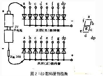 LED數碼管外觀要求顏色均勻、無局部變色及無氣泡等,在業余條件下可用干電池進一步檢測。如圖2所示。以共陰極數碼管為例介紹檢測方法。;將3;V干電池負極引出線固定接觸在LED數碼管的公共陰極上,電池正極引出線依次移動接觸筆畫的正極端。這一根引出線接觸到某一筆畫的正極端時,那~筆畫就應顯示出來。用這種簡單的方法就可檢測出數碼管是否有斷筆(某筆畫不能顯示),連筆(某些筆畫連在一起),并且可相對比較出不同的筆畫發光的強弱性能。若檢測共陽極數碼管,只需將電池正負極引出線對調一下,方法同上。