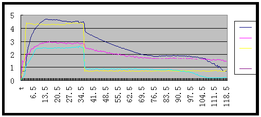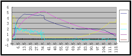 圖5為汽車速度從零加到120KM/H后又由120KM/H減到零時(shí),位置傳感器與輸入軸轉(zhuǎn)速、輸出軸轉(zhuǎn)速和電機(jī)電壓之間的關(guān)系曲線。由圖可知,當(dāng)汽車速度在從零加到120KM/H過(guò)程中,位置傳感器變比由最大開(kāi)始下調(diào)直到變?yōu)樽钚。藭r(shí)對(duì)應(yīng)電機(jī)反轉(zhuǎn)。當(dāng)車速由120KM/H開(kāi)始下降時(shí)位置傳感器先保持不變,此時(shí)電機(jī)不轉(zhuǎn),同時(shí)輸入軸轉(zhuǎn)速和輸出轉(zhuǎn)速成比例的下降,當(dāng)車速達(dá)到一定的值時(shí)位置傳感器速比由最小開(kāi)始上調(diào)直到為最大值,此時(shí)電機(jī)反轉(zhuǎn)(因測(cè)試時(shí)采用的電流傳感器為單方向的,所以圖中沒(méi)有反映出反向電流)。輸入軸轉(zhuǎn)速和輸出軸轉(zhuǎn)速不成比例的下降直至為零。從圖5可以看到車速在上升時(shí),位置傳感器速比的測(cè)試值不斷地減小(對(duì)應(yīng)的轉(zhuǎn)速比增大)。反之,車速在下降的過(guò)程中,當(dāng)車速小于某一值時(shí)測(cè)試值增加。從而實(shí)現(xiàn)了變速箱變比的自動(dòng)調(diào)整。