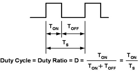 為LED提供脈波電流的方法也稱作PWM,這種方法已經成為改變光等級的首選方法。LED本身是矽元件,對應流經它們的電流導通及關閉而快速地導通和關閉。開關時間在100奈秒(ns)等級,相當于最大頻率10MHz。應用通常以100Hz~100kHz的頻率工作。頻率低于100Hz時,人眼會觀察到LED光閃爍。頻率在500Hz~20kHz之間時,電路可能產生能聽到的雜訊。調光是通過在單個開關周期的某部分時間內將LED導通;而在此開關周期的其余部分時間內,將LED關閉來實現。這種導通關閉周期稱作工作周期(D),其表達方式為LED導通時間(TON)除以整個開關/導通周期時間(TS)(圖3)。