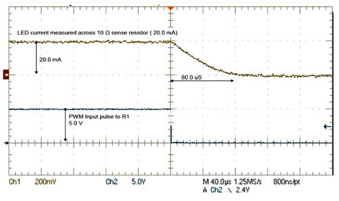 在LED導通期間,流經LED的電流保持恒定,使LED發射的光恒定,且無色度(色彩)變化。亮度與LED導通時間所占的百分比成正比。