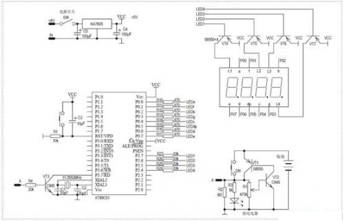 在實際電路中,L1就是第一只數(shù)碼管的共陽極端。單片機的輸出、輸入接口數(shù)量都很有限,所以4位LED數(shù)碼管驅(qū)動都是使用動態(tài)顯示的方式。4只獨立數(shù)碼管LED的內(nèi)部a、b、c、d、e、f、g、dp這8段發(fā)光管相對應(yīng)的陰極都是并連的。統(tǒng)一由單片機P0口8位輸出進行驅(qū)動。數(shù)碼管要顯示出數(shù)碼還必須在共陽極端同時施加正電壓才行。所以要讓4位中某一數(shù)碼管進行顯示,只要在P0口輸出字型碼的同時,給這位數(shù)碼管共陽極端加上正電壓就行了,當然與此同時其他三位數(shù)碼管的共陽極端要保持低電壓,才不致顯示出現(xiàn)混亂。數(shù)碼管共陽極端驅(qū)動電流較大,所以采用了三極管進行控制。以第一只數(shù)碼管為例,在P0端口輸出字型碼的同時,P37輸出低電平,三極管T4導(dǎo)通,則共陽極端L1就得到高電平了,數(shù)字就會顯示在第一只數(shù)碼管上了。