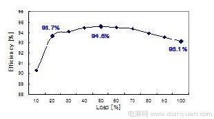 轉(zhuǎn)換器的效率如圖 7 所示,在額定負載為 20%、50% 和 100% 的情況下測得的效率分別為93.7%、94.6% 和 93.1%,這顯示了邊際性能,因而使用設(shè)計優(yōu)良的 PFC 和 DC-DC 級能夠達到85 PLUS 規(guī)范要求。