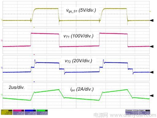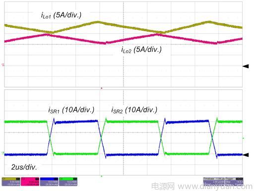 圖 4 和圖 5 所示為轉(zhuǎn)換器在標稱輸入和全負載情況下的實驗波形。S1 的柵極信號,主變壓器的初級端和次級端的電壓和初級端電流如圖4所示。請留意這些波形與理論分析很好地吻合,包括ZVS 運作。輸出電感電流和 SR 的電流如圖 5 所示,由于占空比和寄生組件,輸出電感電流是不均衡的,這意味著平均勵磁電流小于中心抽頭式配置(注 1)。