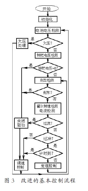 根據(jù)上述思路將軟件控制流程進(jìn)行修改。如圖3 所示。將“速度增大而電流不增”作為“過(guò)沖”的判斷依據(jù)。控制器持續(xù)檢測(cè)速度變化和電流變化,再經(jīng)過(guò)判斷,如果不屬于“過(guò)沖”的情況,則執(zhí)行子程序“調(diào)速控制”。這種情況下控制器檢測(cè)轉(zhuǎn)把電壓值來(lái)調(diào)整PWM,增大或減小電流值使速度變化直至達(dá)到操作者通過(guò)轉(zhuǎn)把設(shè)定的速度值。