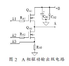3)直流無(wú)刷電機(jī)的驅(qū)動(dòng)控制:參見(jiàn)圖1,此電路采用三相無(wú)刷直流電機(jī)。3 個(gè)霍爾位置傳感器的空間間距為120o,輸出信號(hào)a、b、c最終送給單片機(jī)作為轉(zhuǎn)子位置檢測(cè)信號(hào)及測(cè)速信號(hào)。其中A 相末級(jí)電路如圖2 所示,在驅(qū)動(dòng)電路中設(shè)置了電流檢測(cè)。單片機(jī)根據(jù)霍爾轉(zhuǎn)速信號(hào)和電流檢測(cè)信號(hào),經(jīng)過(guò)分析判斷,輸出正確的PWM 控制信號(hào)給相應(yīng)的線(xiàn)圈通電,從而控制電動(dòng)機(jī)的起動(dòng)、停止及轉(zhuǎn)速等。