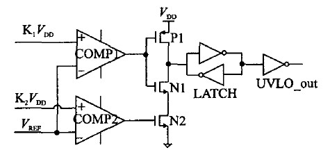 電路的工作原理可簡述如下:12 V供電電壓可在VDD比較低時建立一個PTAT (ProportiONal toabsolute temperature)電流源,然后利用其建立起帶隙基準電壓源;當VDD由0上升時,帶隙基準電壓r首先建立,此時兩個比較器的輸出為低電位,P1導通,輸出為高電位;當K1VDD大于 r時,COMP1輸出跳變,N1管導通,鎖存器鎖存上一個信號,UVLO為高電位(注意其為低電位有效);當K2VDD大于VREF 時,N2導通,則UVLO-out為低電位,使能其他模塊;隨著VDD減小,K2VDD首先小于VREF,N2關斷,則鎖存器鎖存信號,UVLO-out保持;當 VDD減小到K1 VDD小于VREF時COMP1跳變,P1導通,N1關斷,則輸出UVLO-out為高電位,關斷整個控制芯片。