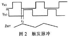VM1導(dǎo)通ton時,可得: 公式,電流紋波為: 公式,VM1關(guān)斷,電流通過VD續(xù)流,接著VN2導(dǎo)通。由于VM2的阻抗遠(yuǎn)小于二極管阻抗,因此通過VM2續(xù)流。VMl、VN2觸發(fā)脈沖如圖2所示。圖2中td為續(xù)流二極管導(dǎo)通時間。