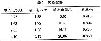 實驗中用50 A的2個二極管串聯(lián)作為負(fù)載,輸入電壓12 V時,不同電流下輸出及效率如表1所示。