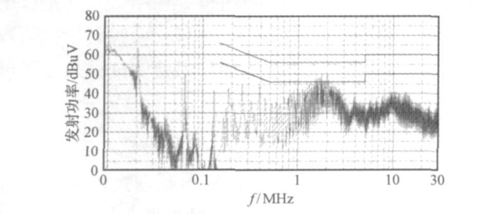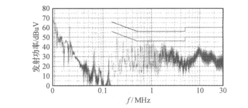 一鎳氫電池充電器產品, 額定功率5W.在其出廠前, 用實驗室設備(人工電源網絡為PMM L2??16A,EM I接收機為PMM9010) 對其進行預測試, 采用的測試標準為GB55014,,其結果如圖4所示。