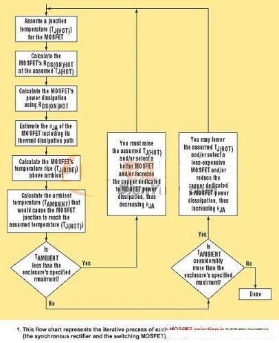 這一過程從首先假設各MOSFET的結溫開始,同樣的過程對于每個MOSFET單獨進行。MOSFET的功率耗散和允許的環(huán)境溫度都要計算。