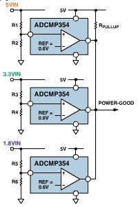 下圖1所示為利用ADCMP361監(jiān)控多路電壓軌的簡(jiǎn)單方法,這是一款內(nèi)置基準(zhǔn)電壓的雙極性輸出、±0.275%精度的比較器 。由于ADCMP361內(nèi)置400mV高精度基準(zhǔn)電壓源,因此可以精確的監(jiān)控非常低的電壓,例如0.9V 的電壓軌。其中,每路電壓軌都使用獨(dú)立的電路。電阻分壓器將電壓軌按比例降低,并為每一路電源設(shè)置一個(gè)欠壓跳變點(diǎn)。所有的輸出被連接在一起,產(chǎn)生通用電源良好信號(hào)。