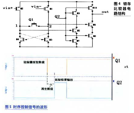 因前置放大器的增益與輸入電壓的乘積不足以達(dá)到輸出VOH的要求,所以把放大后的電壓再加到鎖存器上即可以得到所要求的電壓。第三級(jí)比較器的結(jié)構(gòu)采用可再生比較器,它也是使用正反饋來(lái)實(shí)現(xiàn)兩個(gè)信號(hào)的比較。可再生比較器又稱為鎖存比較器。比較器中兩相非交疊時(shí)鐘控制,確定不同的工作模式,從而實(shí)現(xiàn)比較器的復(fù)位與輸出。其電路的拓?fù)浣Y(jié)構(gòu)如圖4所示。其中兩相非交疊時(shí)鐘Q1和Q2的波形如圖5所示。