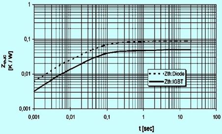 通常處于周期性脈沖功耗負載下的平均和最大結溫可以參考廠家所給出的瞬態(tài)熱阻曲線來計算。如圖3示出了eupc型號為bsm400ga120dlc的igbt模塊瞬態(tài)熱阻曲線zthjc=f(t)。