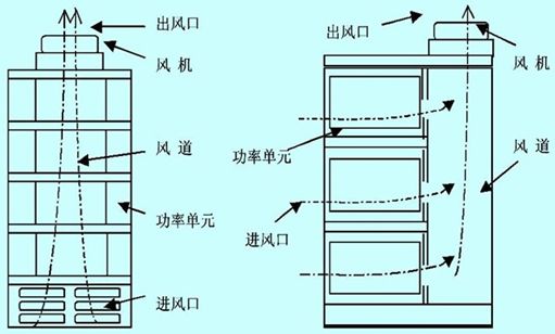 高壓變頻器常風的冷卻方式主要為散熱器強制風冷、循環(huán)水冷卻和熱管冷卻等。因強制風冷方式簡單,不存在水冷時的凝露問題,以及熱管散熱器設計的復雜性,在確定合適的通風結構的情況下,一般采用此種方式。采用強制風冷方式需要在結構設計時考慮散熱風道。散熱風道的設計應在充分考慮單元散熱的要求下,應盡量優(yōu)化。常見的多電平串聯方式的高壓變頻器,從結構上分為功率柜體、變壓器柜、控制柜。功率柜風道設計通常有兩種方式:串聯風道和并聯風道。