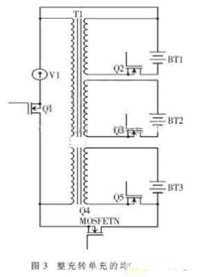 電池組常用的均衡方法有分流法、飛速電容均衡充電法、電感能量傳遞方法等。在本系統中,需要較多的I/O口驅動開關管,而單片機的I/O口有限,所以采取整充轉單充的充電均衡方法。原理圖如圖3所示。Q4是控制電池組整充的開關,Q2、Q3、Q5是控制單節電池充電的開關。以10節錳酸鋰電池組為例,變壓器主線圈兩端電壓為42 V,副線圈電壓為電池的額定電壓4.2 V。剛開始Q4導通,Q2、Q3、Q5截止,單節電池的電壓不斷升高,當檢測到某一節電池的電壓達到額定電壓4.2 V以后,電壓檢測芯片發出驅動信號,關閉Q4,打開Q2、Q3、Q5,整個系統進入單充階段,未充滿的電池繼續充電,以達到額定電壓的電池保持額定電壓不變。經測試,電壓差值不會超過50 mV。