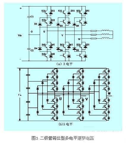 1977年德國學者holtz首次提出了利用開關管來輔助中點箝位的三電平逆變器主電路,1980年日本的a·nabae等人對其進行了發展,提出了二極管箝位式逆變電路。圖3(a)為二極管箝位逆變電路,它具有2個電容,能輸出3電平的相電壓。
