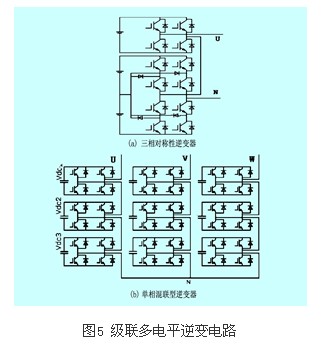 多電平逆變器實現的結構一般主要有:二極管箝位型(diode-clampedinverter)、飛跨電容箝位型(flying-capacitorinverter)、具有獨立直流電源的級聯型(cascaded-inverters with separate dcsources)、具有多繞組變壓器輸出的多重化型等等。