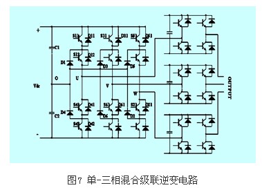 除了上述的聯結方式以外,還有由一個三相三電平二極管箝位逆變器或飛跨電容型逆變器和三個單相h橋逆變器串聯形成的三相級聯逆變器。這種電路結構簡單,控制也易于實現,實際中已有使用。圖7為單-三相混合級聯逆變電路圖。