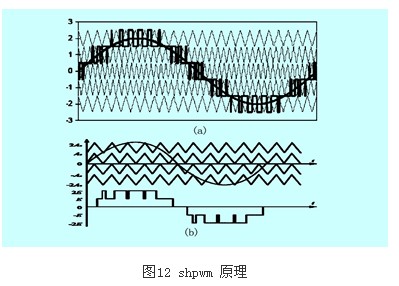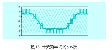 該方法只適用于三相系統,因為注入的零序分量在單相系統統中無法相互抵消,從而在輸出波形中存在三次諧波,如圖13所示。也有人把開關頻率優化pwm法和三角波移相pwm法結合產生新的ps-sfopwm法,該法特點:在相同的開關頻率下,等效開關頻率提高了很多倍,因而諧波大大減小,電壓調制比提高了1.15倍。