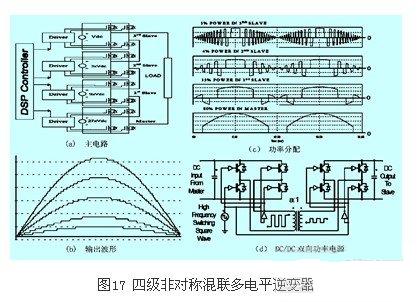 有些學者為非對稱混聯多電平逆變電路提出了主從逆變單元的概念。主逆變單元(master)就是串聯連接的逆變器中,直流電壓最高的單元,它承擔級聯逆變器大多數的功率,通常由gto、igct完成,同時通過dc/dc雙向功率電源向從逆變單元(slave)供電。其它的逆變單元稱為從逆變單元,直流電壓較低,只負責完成自己的逆變任務。圖17所示為(a)(b)(c)(d)分別為4級連接81電平的逆變器主電路、輸出波形、功率分配情況及dc/dc雙向功率電源。