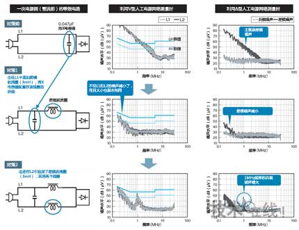 作為噪聲水平較高的共模噪聲對策,①安裝了標準的共模扼流圈(3mH)。這樣做雖然共模噪聲大幅衰減,但差模噪聲并沒有衰減,因此低頻帶范圍的電磁噪聲依然高于規定值。