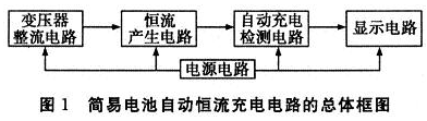 簡易電池自動恒流充電電路的總體框圖如圖1所示。它是由變壓器整流電路、恒流產(chǎn)生電路、自動斷電電路、顯示電路和電源電路5部分構(gòu)成。