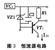 如圖3所示,由穩(wěn)壓管VZ1、晶體管VT1、電阻R1、電容C2構(gòu)成的晶體管電流源提供恒定電流,取穩(wěn)壓管電壓為5 V,R1為51 Ω,此時IC≈1OO mA,作為電路的充電電流。