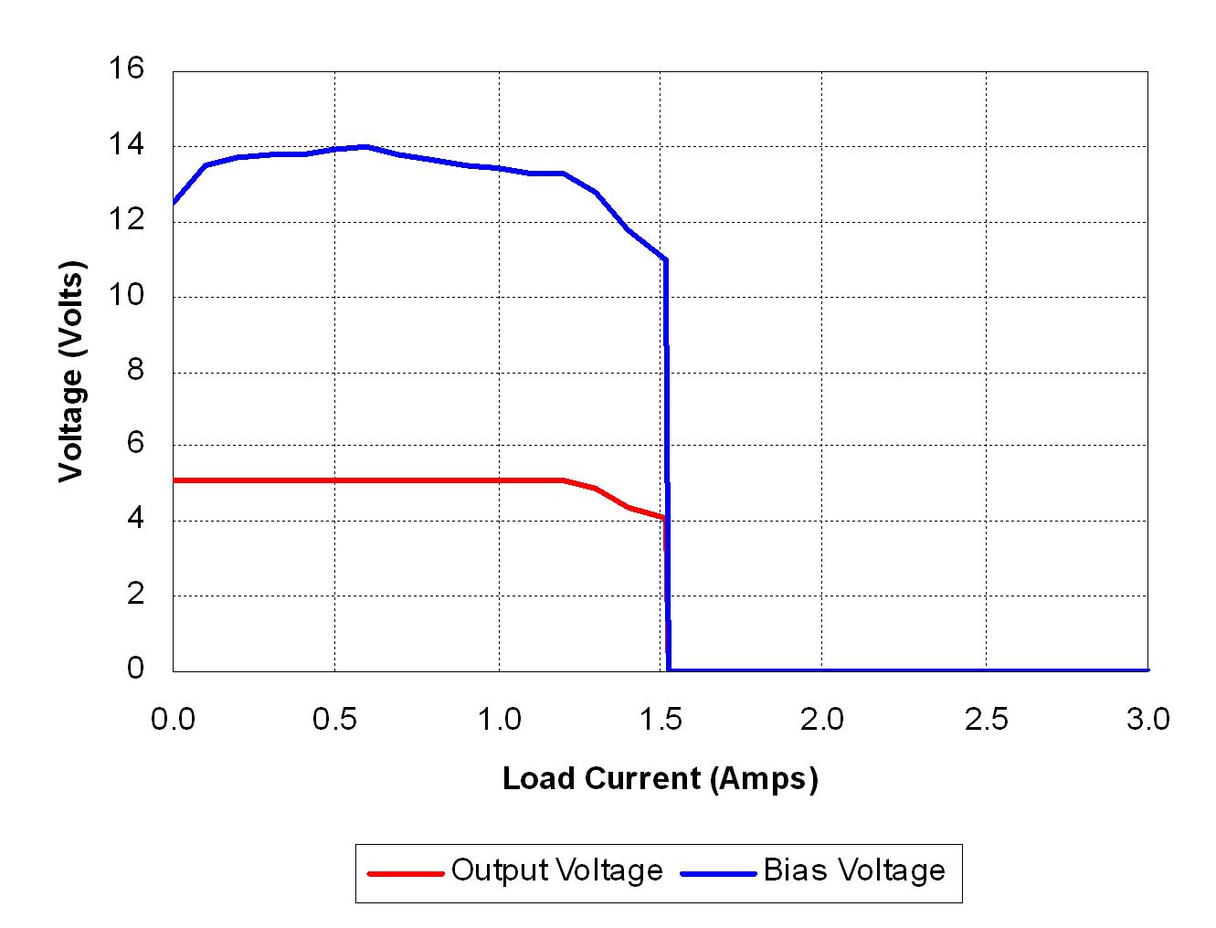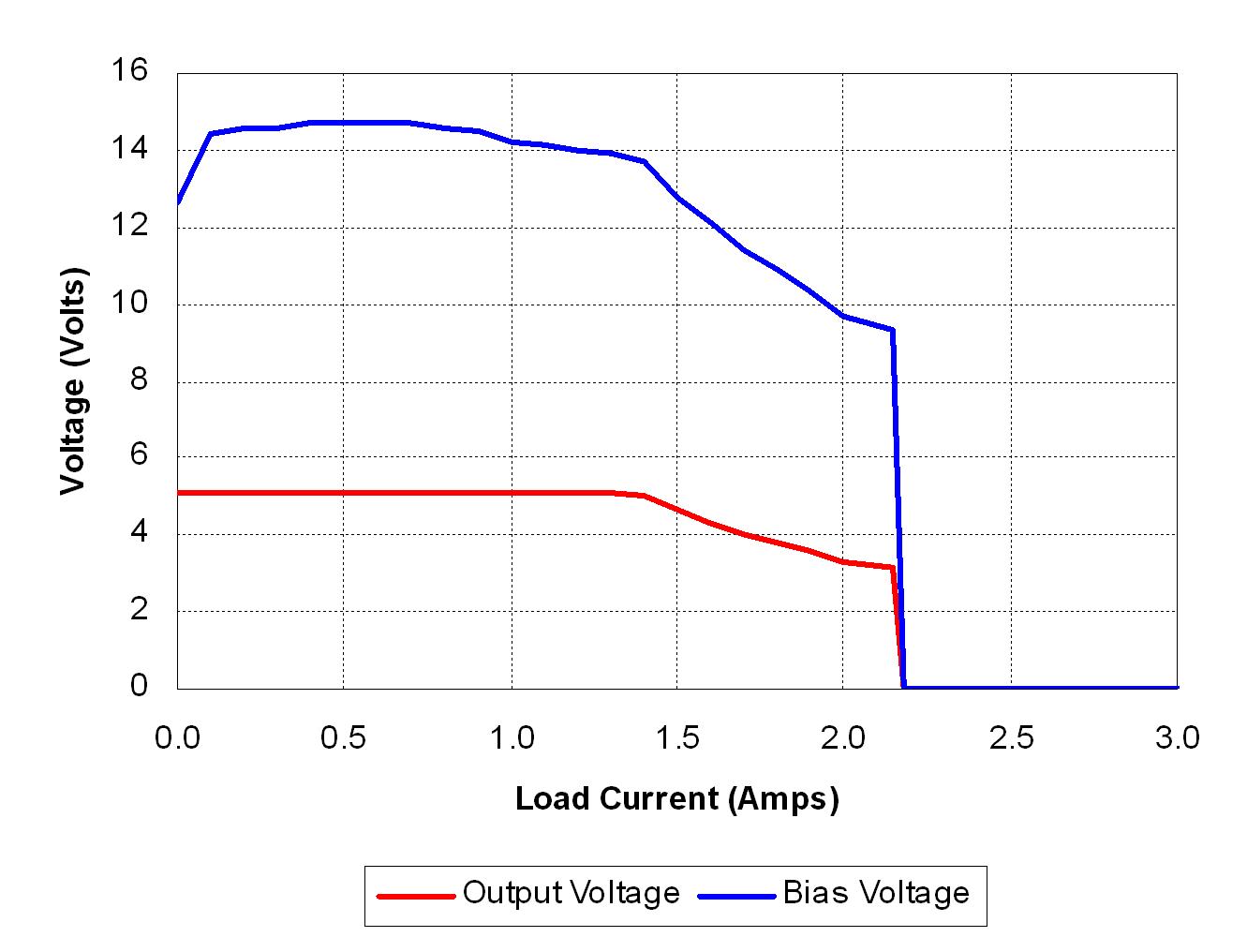 圖3顯示了輸出和偏置電壓與圖2所示電路負載電流的對比情況。輸出V-I特性非常接近于圖1所示理想情況。負載電流達到約1.3A時開始功率限制。隨著負載增加,輸出電壓開始下降。由于偏置電壓是輸出電壓的反映,因此它也開始下降。偏置電壓降至9V關閉水平以下時,PWM控制器關閉。