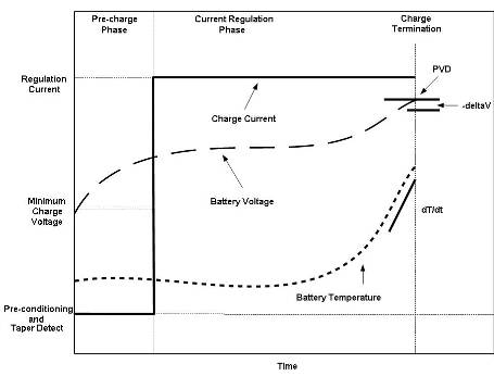 當(dāng)電池溫度和電壓正確時(shí)快速充電開始。通常用 1C 或更低的恒定電流對(duì) NiMH 電池進(jìn)行充電。一些 NiCd 電池可以用高達(dá) 4C 的速率進(jìn)行充電。采用適當(dāng)?shù)某潆娊K止來(lái)避免有害的過(guò)充電。