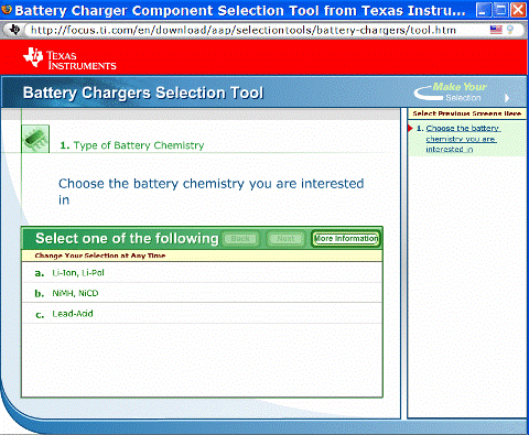電池充電器工具使得設(shè)計(jì)人員選擇正確的充電器的過(guò)程更輕松。圖 3 是 TI 網(wǎng)站上提供的一種工具的示例。