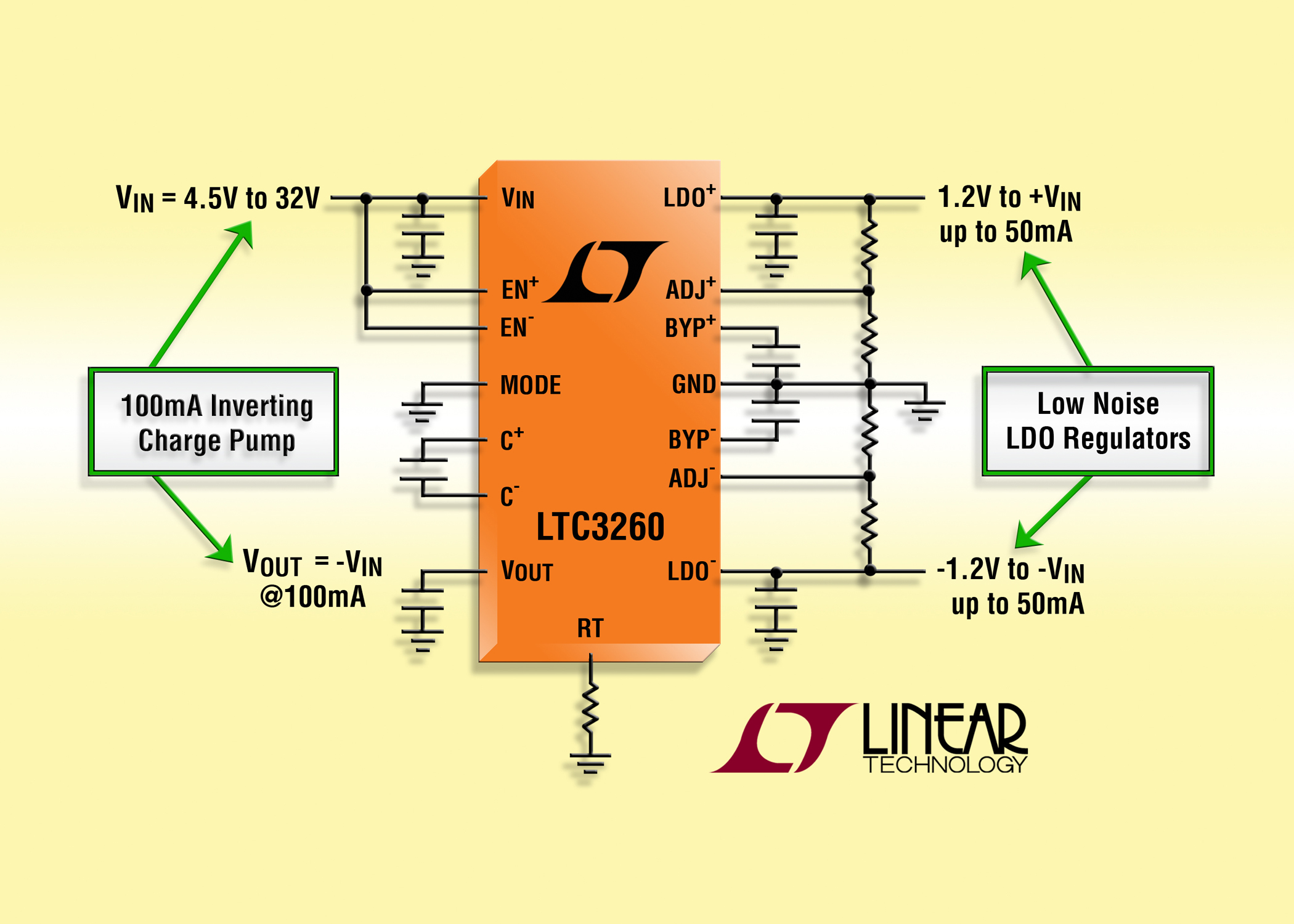 加利福尼亞州米爾皮塔斯 (MILPITAS, CA) – 2012 年 5 月 10 日 – 凌力爾特公司 (Linear Technology Corporation) 推出通用高壓充電泵 LTC3260 和 LTC3261。LTC3261 是高壓負輸出充電泵,可提供高達 100mA 的輸出電流。LTC3260 具有與 LTC3261 相同的充電泵,但還包括兩個正及負 LDO 穩壓器,每個 LDO 穩壓器可提供高達 50mA 的輸出電流。負 LDO 后置穩壓器由負輸出充電泵的輸出供電。正和負 LDO 輸出電壓可用外部電阻器分壓器分別調節至 1.2V 和 -1.2V。兩款器件均在 4.5V 至 32V 的寬輸入電壓范圍內工作。