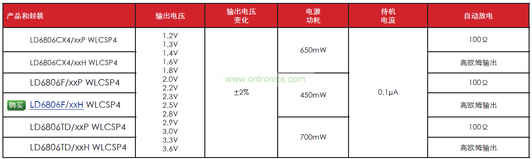 LD6806 系列在 200mA 額定電流時典型的壓降只有 60mV,通過提供關機模式,吸取的靜態電流典型值僅為 1.0μA,從而幫助節省電池能量。此外,能夠在 200μs